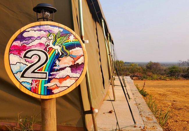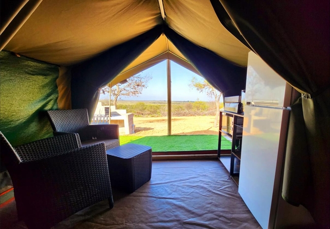 Glamp Tents Twin are permanent canvas tents furnished with two single beds and a seating area. A stretcher bed can be provided for a child. Each tent has a fridge-freezer, induction plate, microwave and kettle. There is a patio with two chairs and there are private braai facilities. Guests have use of separate ladies and gents ablution facilities with baths and showers, toilets and washbasins.
