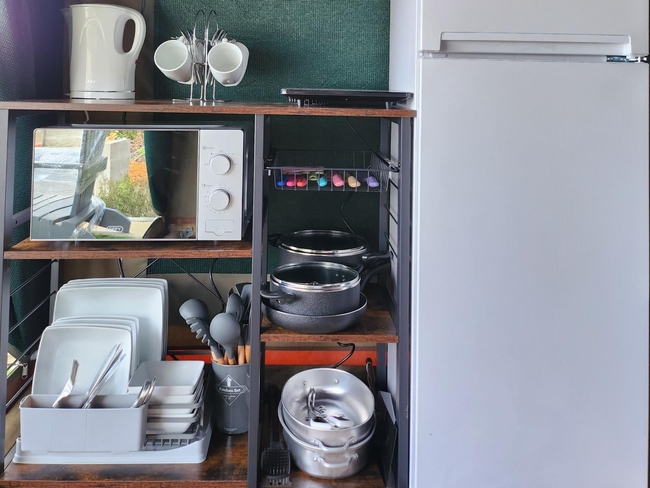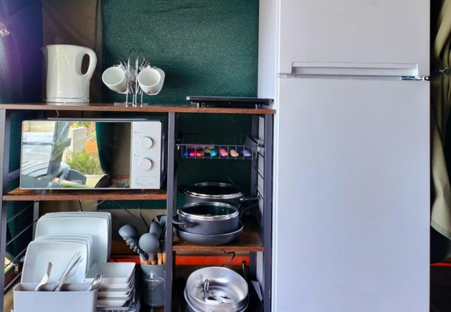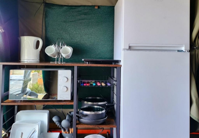 Peace Haven at Windfarm glamping tents are located approximately 80m apart, ensuring privacy, and contain a Queen-size bed or two single beds and a seating area. A stretcher for one child can be arranged. Each tent is equipped with an induction plate, fridge-freezer, microwave, kettle, cutlery and crockery.