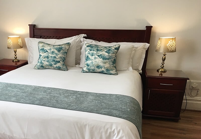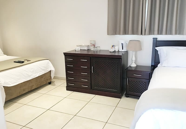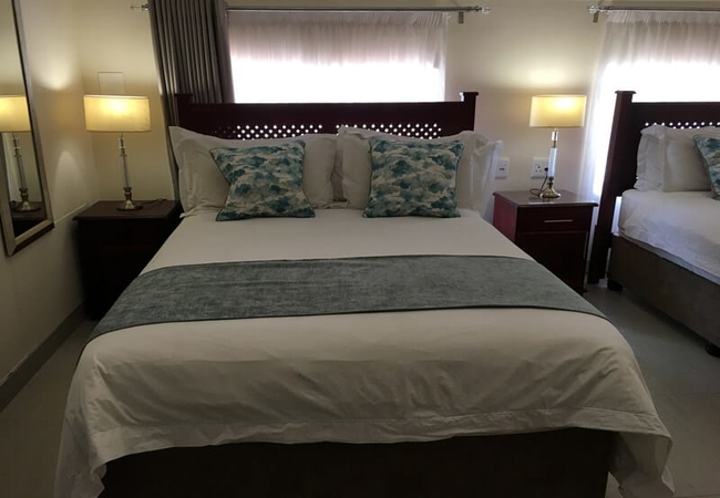 The Twin Double Room is furnished with TWO double beds with en-suite bathroom. Each room boasts a HD flat screen TV with full DStv, a telephone, free Wi-Fi, tea and coffee making facilities, a mini bar, air-conditioning and electric blankets. There is secure parking on site.
