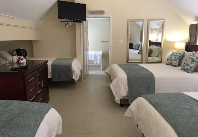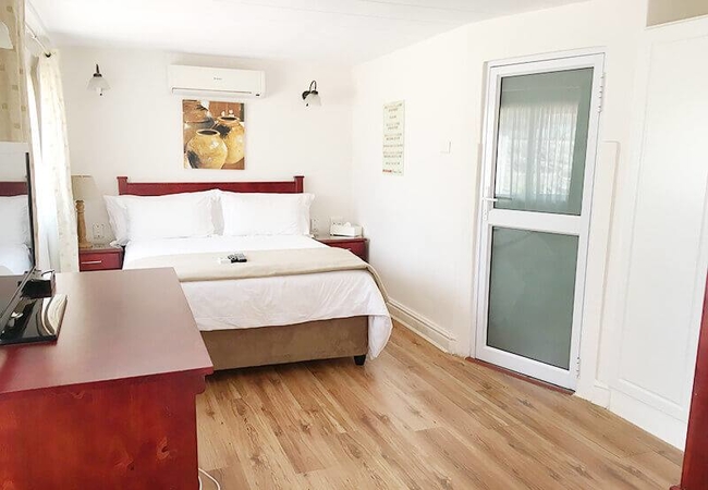 The Triple Room is furnished with one double bed plus one single bed with en-suite bathroom. Each room boasts a HD flat screen TV with full DStv, a telephone, free Wi-Fi, tea and coffee making facilities, a mini bar, air-conditioning and electric blankets. There is secure parking on site.