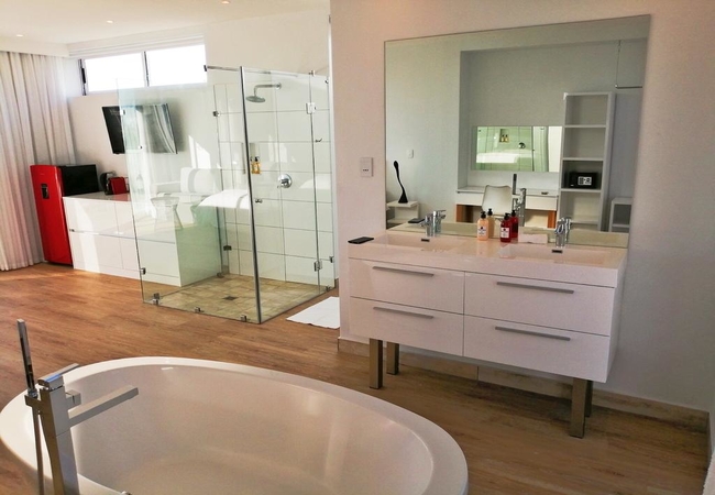 This room has a King-size bed and has an open-plan bathroom with a shower and a bath. The room is equipped with a mini-bar fridge, Nespresso machine, kettle and a selection of tea. The room has its own private balcony and offers distant views of Table Mountain and the ocean. There is also air-conditioning and a flat-screen TV with selected DStv and Netflix in the room.