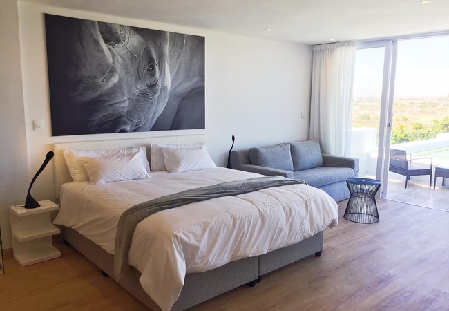 The room is furnished with a King-size bed and has an open-plan bathroom with a spa bath. The room is equipped with a mini-bar fridge, Nespresso machine, kettle and a selection of tea. The room its own two private terraces. There is also air-conditioning and a flat-screen TV with selected DStv and Netflix in the room. Golf and pool terrace views.