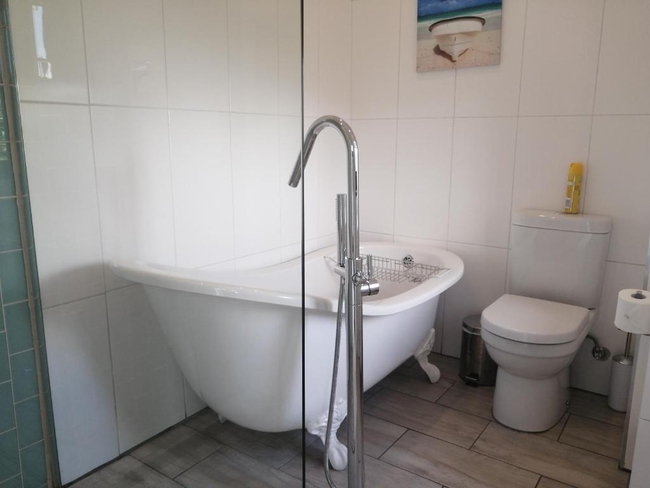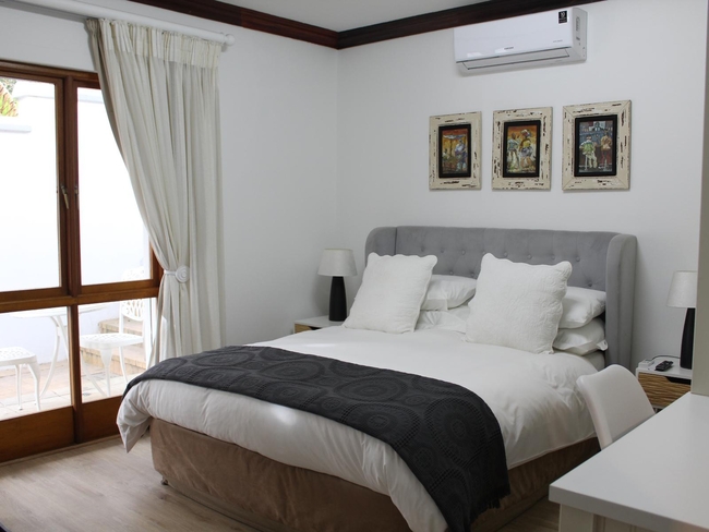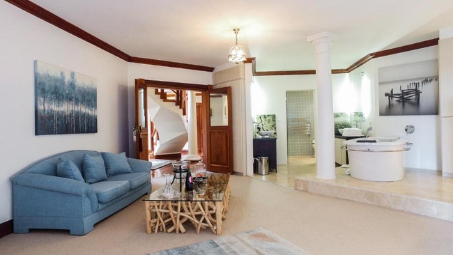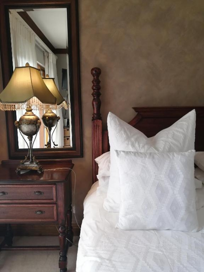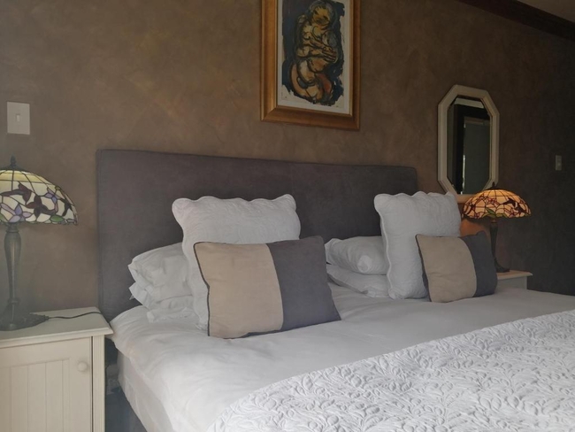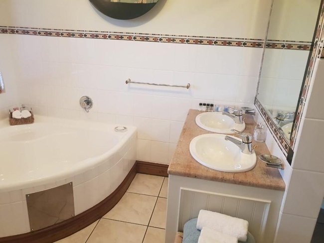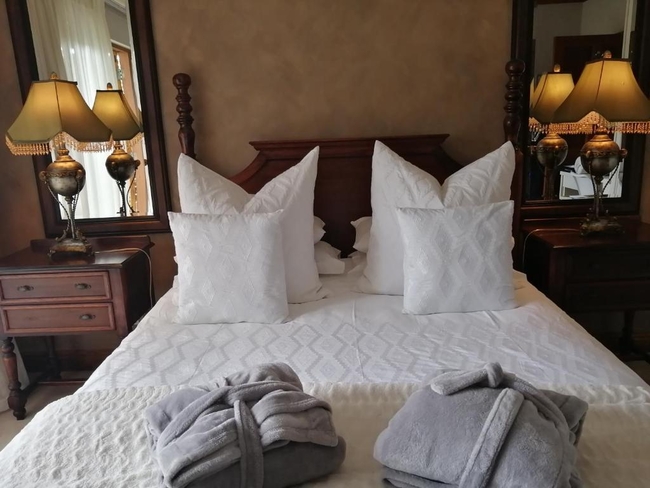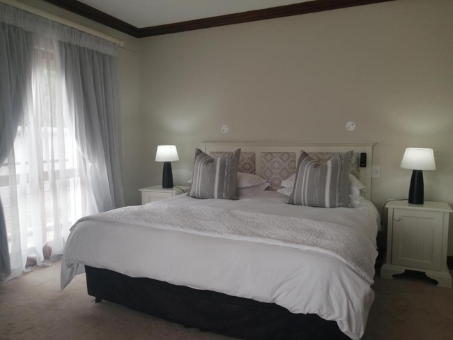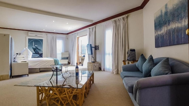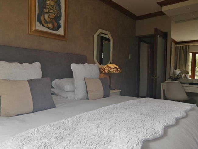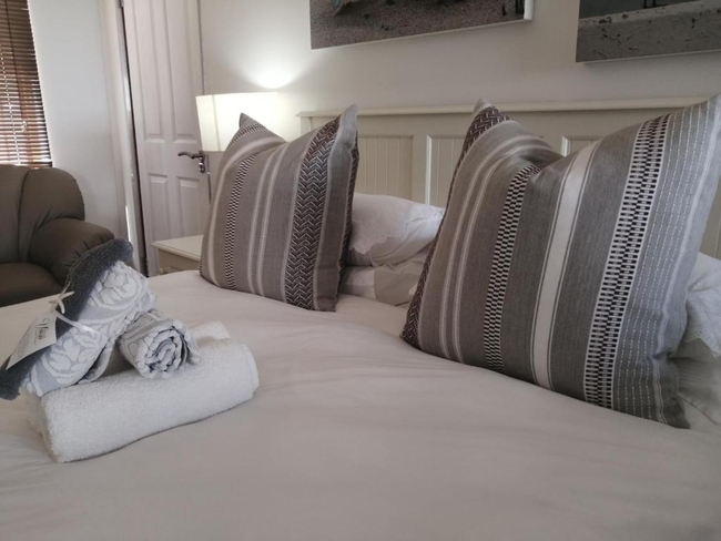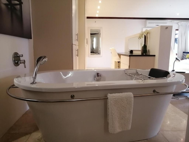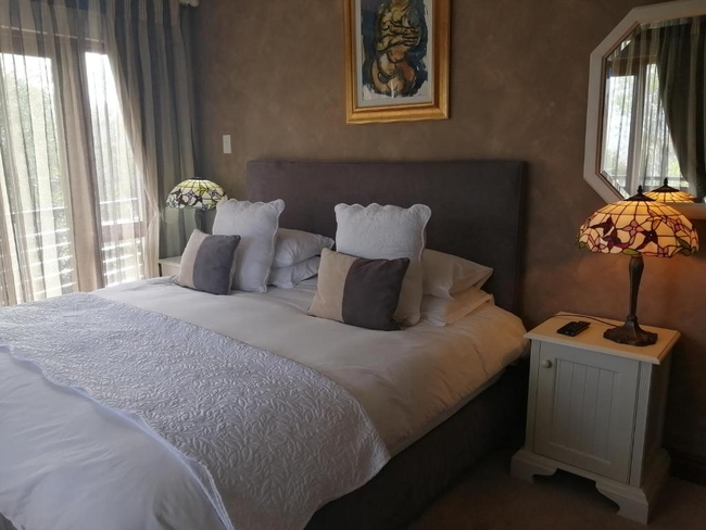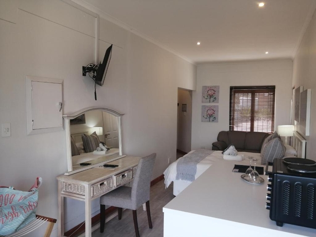 The Pearl Suite is furnished with a king-size bed. The en-suite bathroom is equipped with a shower and bath, toilet and basin. The room is equipped with WiFi connection, tea and coffee making facilities, built-in cupboard, TV with Netflix as well as a balcony with a braai.