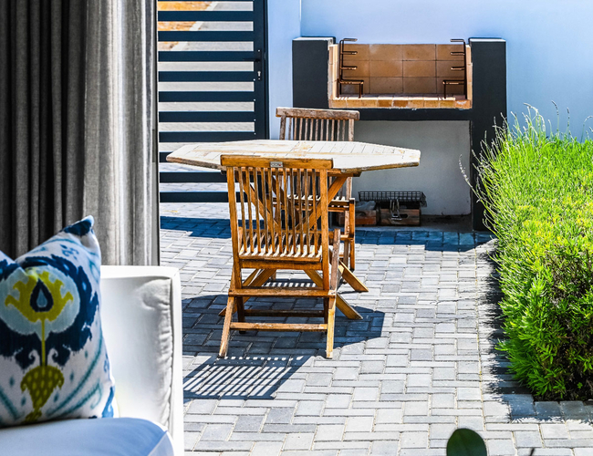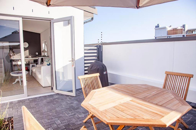 Downstairs, the kitchenette is equipped with a microwave, fridge and induction plate. The living area has a TV with some satellite channels and Netflix. Wi-Fi is also provided. The living area leads onto a small patio with outdoor furniture and portable braai facilities.