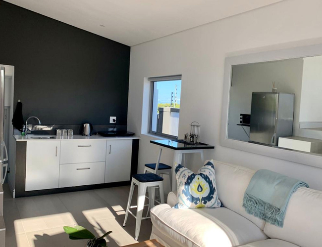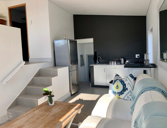 Pelican's View is an open-plan apartment with a double bed on the upper floor which is accessed via stairs. The bathroom has a shower. Downstairs, the kitchenette is equipped with a microwave, fridge and induction plate. The living area has a TV with some satellite channels and Netflix. Wi-Fi is also provided. The living area leads onto a small patio with outdoor furniture and portable braai facilities. Secure onsite parking is available.