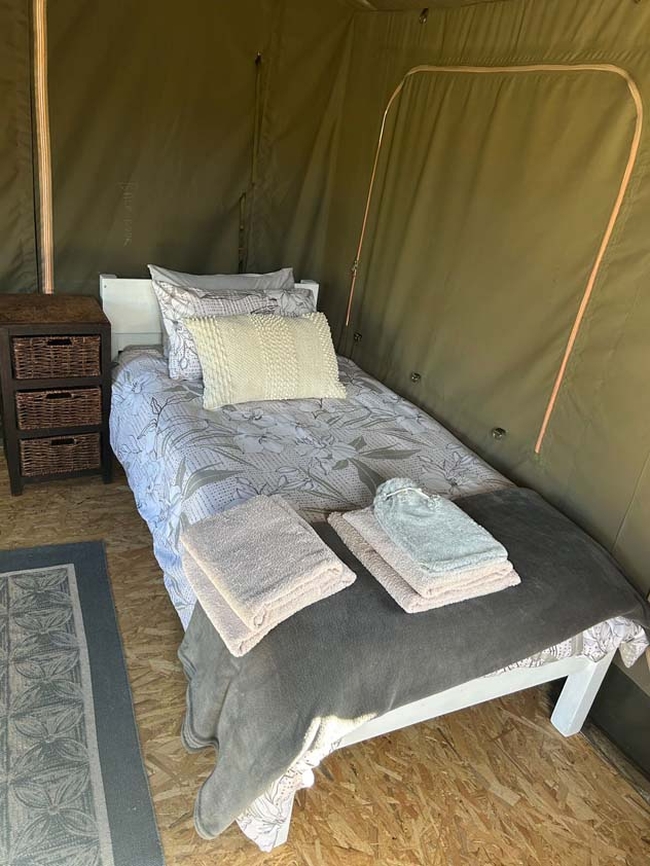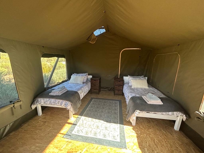 Structured Tent: A safari-style tent featuring a private bathroom with a shower, a lounge area, and a fully equipped kitchen for self-catering convenience.