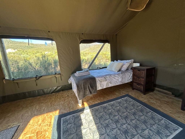 Billy's Tented Camp offers a luxurious take on outdoor camping, perfect for those seeking comfort in the heart of nature. Nestled in the Cederberg Mountain Range, just 207 km from Cape Town, this private retreat provides two safari-style tents, each sleeping two adults in single beds. A separate clubhouse features a fully equipped kitchen, lounge, and dining area, while the outdoor space includes a large stoep for sundowners, a braai area, and a private plunge pool for a refreshing dip. With easy access to hiking, rock climbing, and star-gazing, guests can fully embrace the natural beauty of the area. Furry companions are welcome, and small children can be accommodated with prior notice. Billy's Tented Camp blends the charm of the Cederberg with the convenience of modern amenities for a truly memorable getaway.