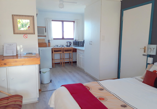 Lovely bright studio furnished with a queen-size bed and en-suite bathroom fitted with over-bath shower, toilet and basin. The studio is let on a room only basis and is equipped with a tea/coffee tray, kettle, fridge and microwave. There is a television and air conditioning unit. Stunning views from the balcony over the pool and garden and across to the Helderberg mountains. There is secure parking within the property and you will receive your own gate control with your studio key when you check in.