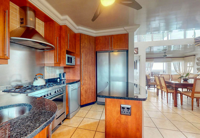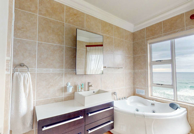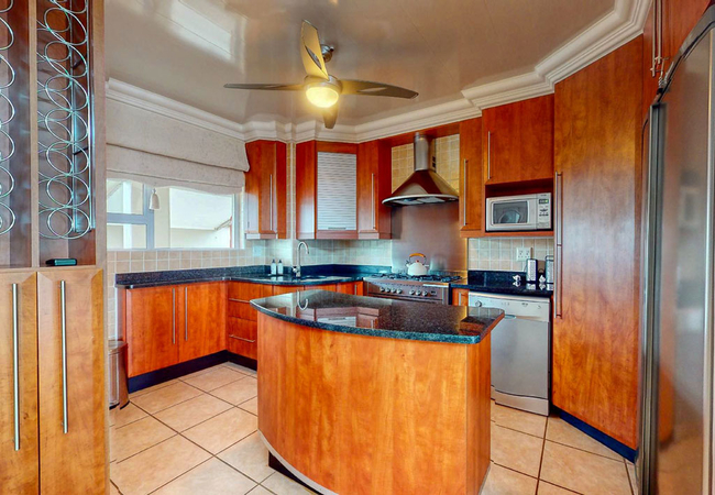 Penthouse @ Aride is a holiday apartment in Uvongo sleeping six guests. The main bedroom is furnished with a queen-size bed and its en-suite bathroom is fitted with a bath and shower. The second bedroom is furnished with a king-size bed and has an en-suite bathroom fitted with a shower, toilet and basin. The third bedroom is furnished with two single beds and uses a separate bathroom fitted with a bath, shower, toilet and basin. The open-plan kitchen is equipped with a fridge-freezer, gas stove, oven, microwave, dishwasher, washing machine, and tumble dryer. The living area features an 8-seater dining table, a comfy lounge suite, and a TV with DStv and Showmax. The living area opens onto a private balcony with an outdoor seating area overlooking the sea. Additionally, the upper floor boasts a covered balcony complete with a bar, a kitchenette, and gas braai facilities. Guests are afforded complimentary Wi-Fi and secure parking is available in a double garage. The complex also offers a backup water supply for added convenience.
