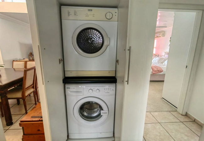 The open-plan kitchen is equipped with a fridge-freezer, gas stove, oven, microwave, dishwasher, washing machine, and tumble dryer. The living area features an 8-seater dining table, a comfy lounge suite, and a TV with DStv and Showmax.