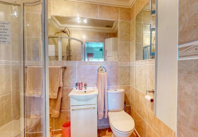 The main bedroom is furnished with a queen-size bed and its en-suite bathroom is fitted with a bath and shower. The second bedroom is furnished with a king-size bed and has an en-suite bathroom fitted with a shower, toilet and basin. The third bedroom is furnished with two single beds and uses a separate bathroom fitted with a bath, shower, toilet and basin.