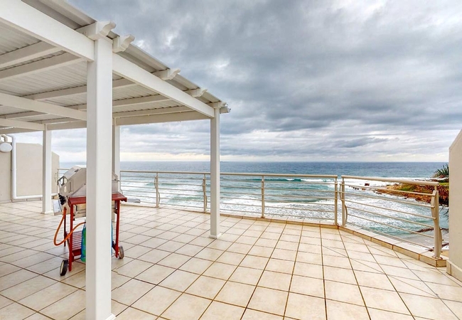 The living area opens onto a private balcony with an outdoor seating area overlooking the sea. Additionally, the upper floor boasts a covered balcony complete with a bar, a kitchenette, and gas braai facilities.