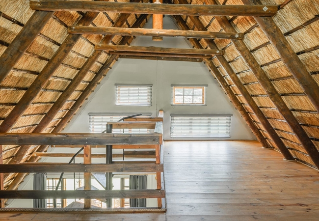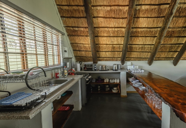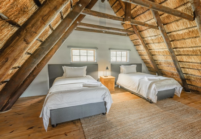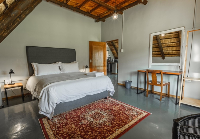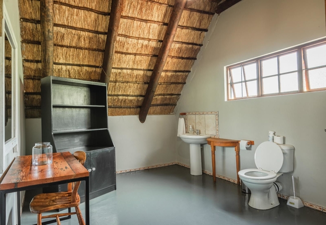 Nguni Cottage is a family self catering sleeping five guests. The bedroom is furnished with a Queen-size bed and the loft area is furnished with two three-quarter beds and a single bed. There is one bathroom fitted with a shower, toilet and basin. This cottage has an open-plan kitchen and living area, and is a perfect cottage for a small family. There is a corner couch, a flat screen TV and a breakfast bar with bar stools. The kitchen is fully equipped and has everything required for a comfortable self catering stay. Outside is a picnic bench and braai facilities.