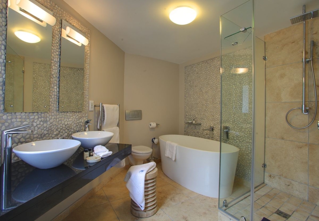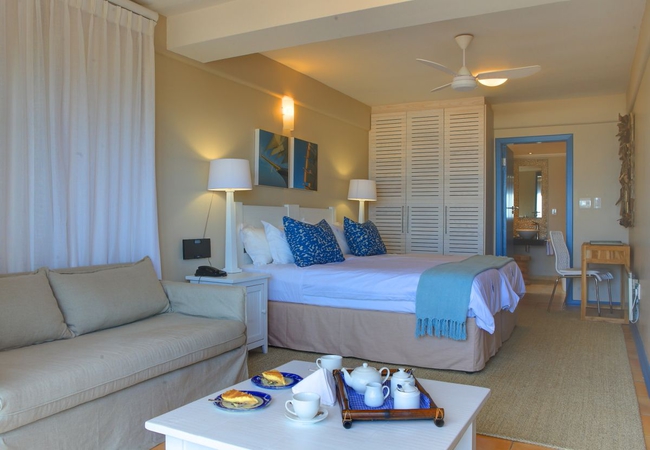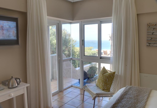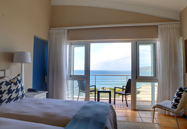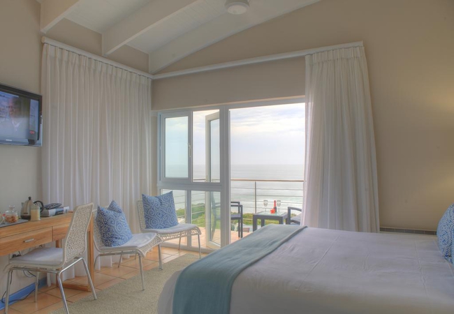 Superior Bedroom, facing the ocean with views of Robberg Peninsula. All rooms are en-suite and have Television, direct dial telephones, personalised linen, heated towel rails, tea and coffee making facilities and bar fridges.