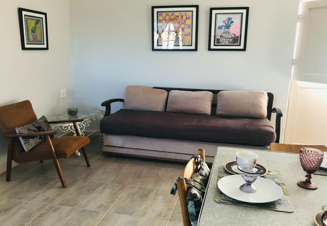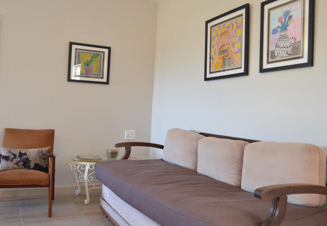 The living room is open plan with a small kitchenette, inside braai and north facing windows for sunny winter bedrooms and great views of the farm. The cottage is spacious and great for entertaining with a patio including outdoor furniture. There is a kitchenette with fridge and microwave and cooking facilities including a double sink.