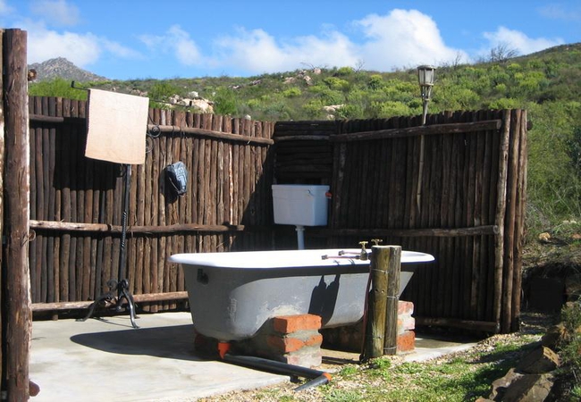 A kilometer from the farmhouse is our biggest self-catering cottage, ‘Die Veepos', built in a Cape vernacular style. It is totally privately set in its own hidden valley amongst the sandstone outcrops and fynbos. It boasts three large bedrooms, a bathroom with shower and bath, lounge and kitchen. Outside on the stoep it has a plunge pool and under a nearby rock outcrop there is a shower to cool you off. ‘Die Veepos' also has a romantic outside bathroom privately set in the bush! Guests can enjoy bathing in an old Victorian bath under the stars, champagne in hand! ‘Die Veepos' is also gas operated for ambience and a green footprint.