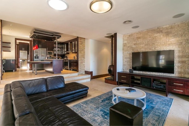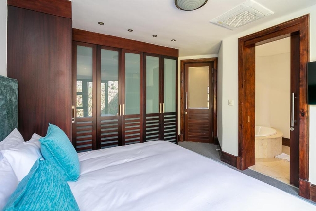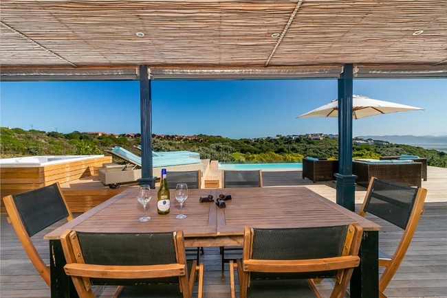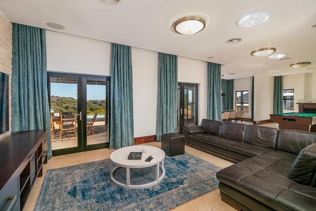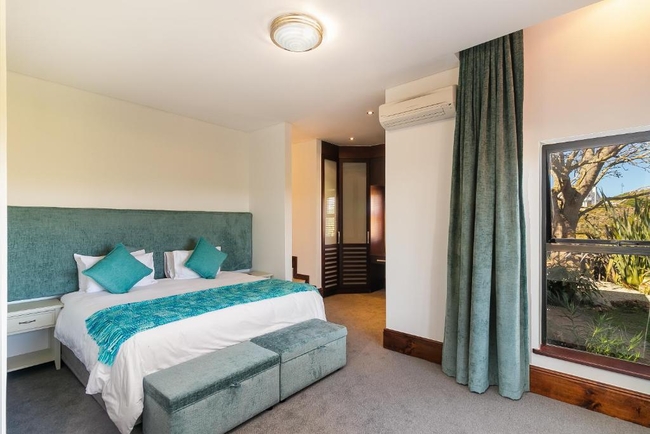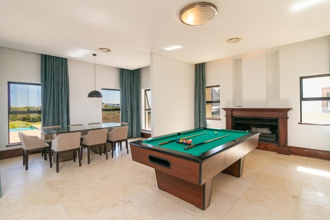 Accommodating up to eight guests, this spacious villa boasts four luxurious bedrooms, each paired with a private bathroom. The primary bedroom, featuring a king-size bed, offers an en-suite bathroom complete with both a bath and a shower for a touch of indulgence. The second bedroom, also furnished with a king-size bed, includes an en-suite bathroom with a shower. The remaining two bedrooms are each fitted with two single beds and come with en-suite bathrooms, each equipped with a shower, ensuring comfort and privacy for all guests. Designed for both relaxation and entertainment, the open-plan living area provides an inviting lounge with a plush couch, a warming fireplace, and a TV, creating a cozy space for guests to gather. The adjacent kitchen is fully equipped with modern appliances, including a double-door fridge-freezer, a gas stove, oven, and microwave, making it a pleasure to prepare meals. The villa's entertainment deck is a true highlight, boasting a heated swimming pool and a Jacuzzi that overlooks some of the estate's finest views. This outdoor area also features a spacious patio, perfect for al fresco dining or simply enjoying the fresh air and serene surroundings. Additional amenities include secure parking, a braai area for traditional South African barbecues, and complimentary Wi-Fi to keep guests connected.