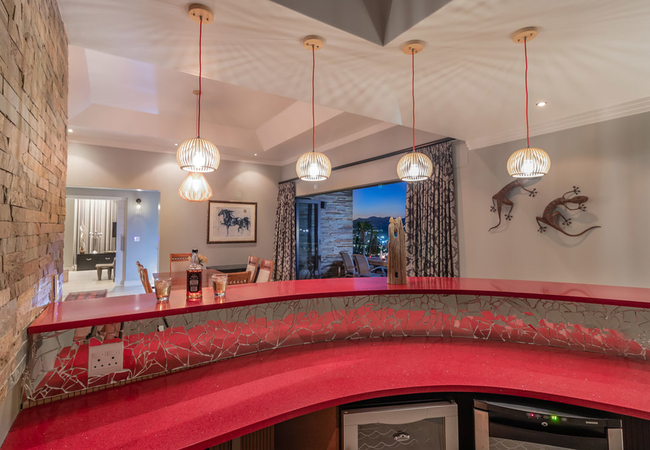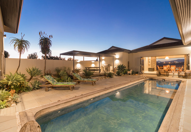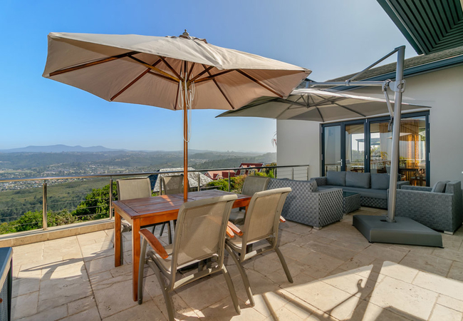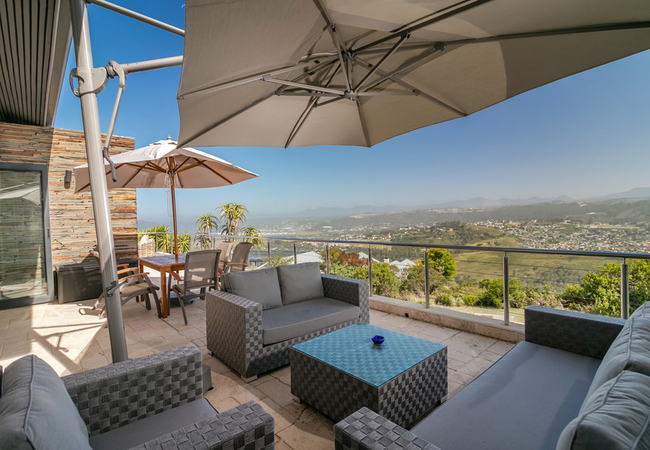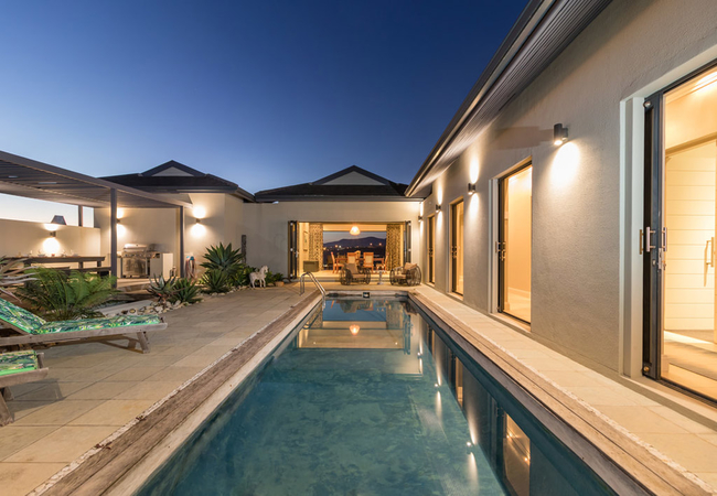 Pezula Heavenly Sunset is a self catering holiday villa sleeping eight guests in four double rooms each with an en-suite bathroom. Each room leads onto a patio / deck area and has its own TV. The exclusive home's open plan lounge, kitchen and dining area flows onto an entertainment deck with a swimming pool which overlooks views of the Knysna Lagoon and Outeniqua Mountains. The living area has leather seats and a large flatscreen TV. The kitchen is modern and fully equipped for your self catering stay. The large pool deck boasts a gas braai and weber with covered entertainment area. There is a double garage to park your vehicles.
