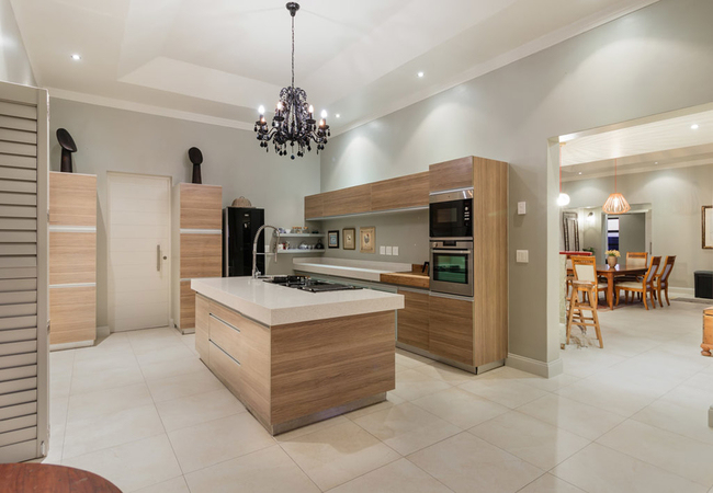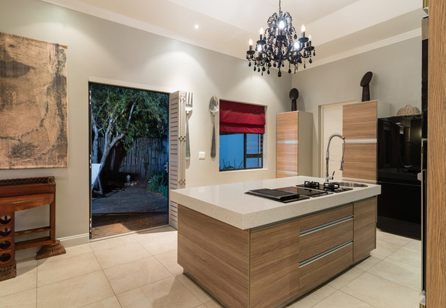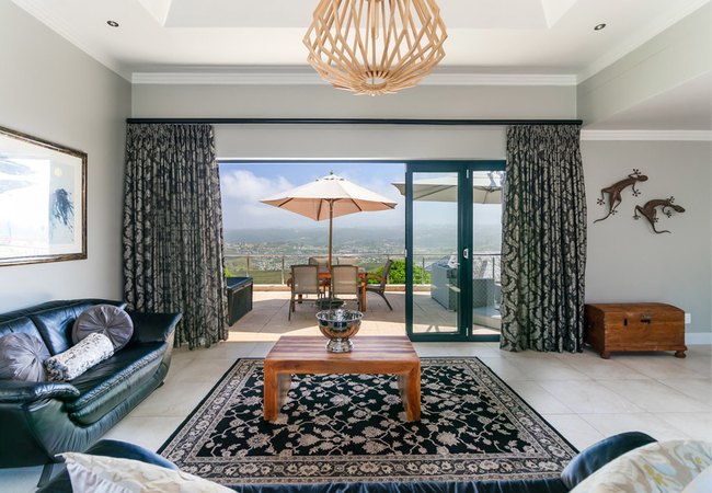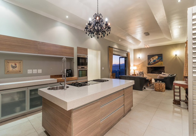 The exclusive home's open plan lounge, kitchen and dining area flows onto an entertainment deck with a swimming pool which overlooks views of the Knysna Lagoon and Outeniqua Mountains. The living area has leather furniture and a large flatscreen TV. The kitchen is modern and fully equipped for your self catering stay.