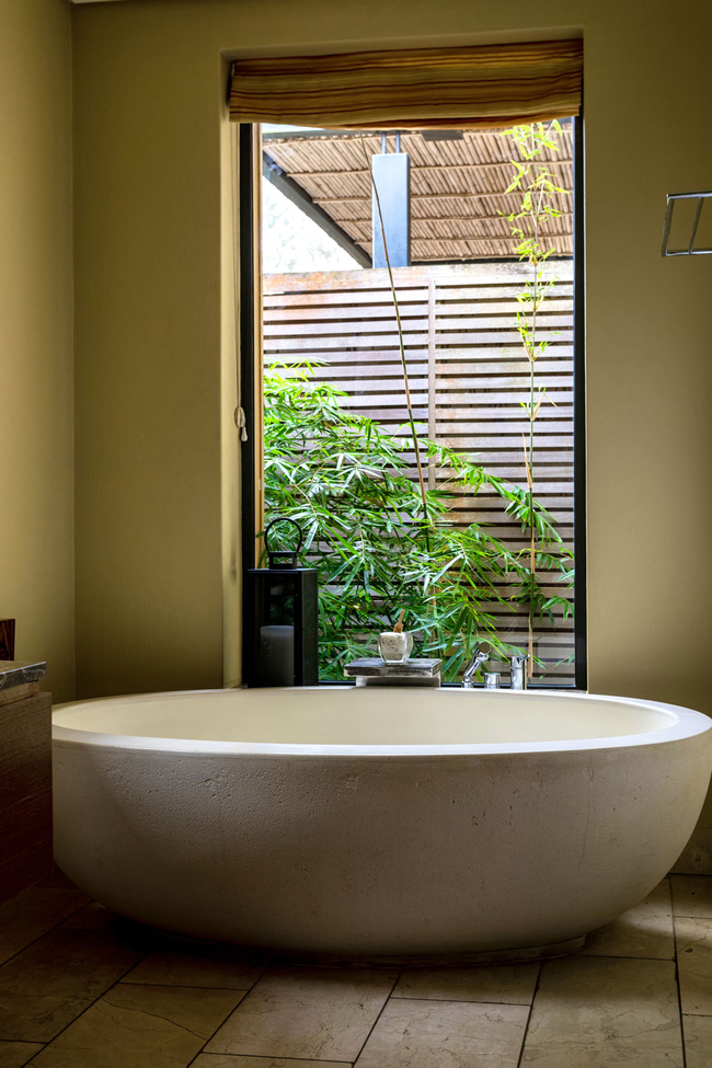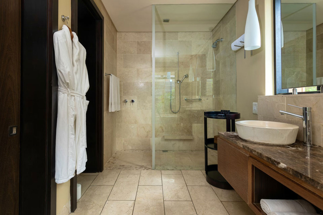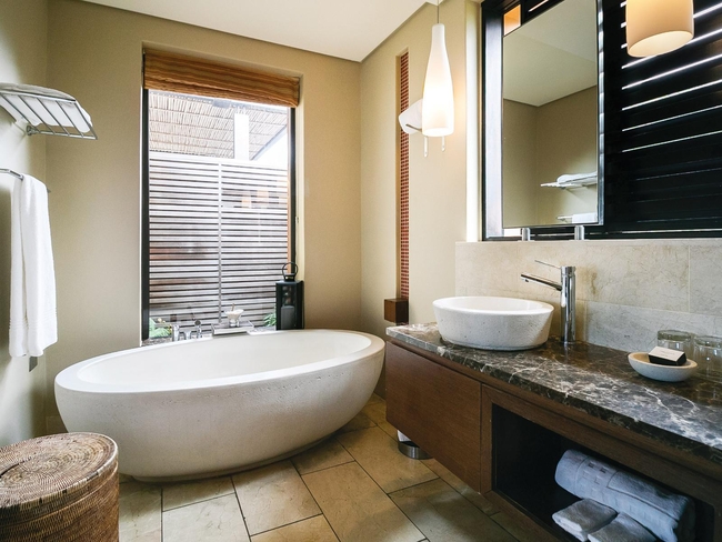 The Nature Inter-leading Family Suite comprises an extra large and a standard suite with a shared front door. The main bedroom is furnished with a king-size bed and offers an en-suite bathroom fitted with a toilet, bidet, basin, shower and bath. The second bedroom has 2 single beds and an en-suite bathroom fitted with a toilet, bidet, basin, shower and bath. The unit has a TV, microwave, and bar fridge as well as its own private pool.