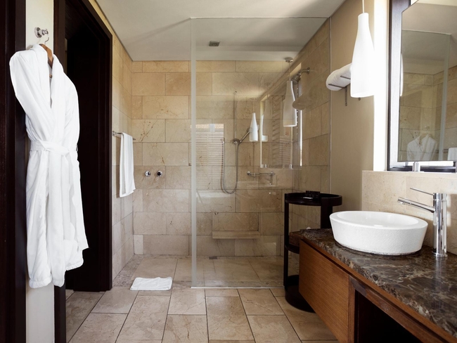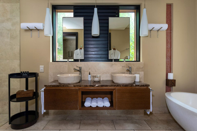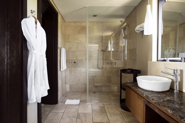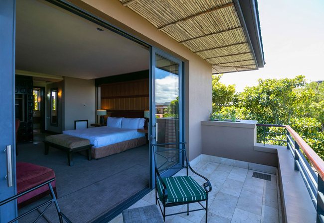 The Sky Vista Inter-leading Suite unit is located on the upper level with garden views as well as views over the golf course, lagoon or ocean, and comprises an extra large and a standard suite with a shared front door. The main bedroom is furnished with a king-size bed and offers an en-suite bathroom fitted with a toilet, bidet, basin, shower and bath. The second bedroom has 2 single beds, for children under the age of 18 years old, and has an en-suite bathroom fitted with a toilet, bidet, basin, shower and bath. The unit has a TV, microwave, and tea- and coffee-making facilities as well as its own private patio. The light-plated breakfast is included in the rate.