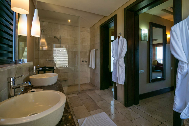The Sky Panoramic Inter-leading Suite consists of an Extra Large and a Large Suites with a shared front door, these family suites are furnished with a king-size bed. The en-suite bathroom is fitted with a toilet, bidet, basin, shower and bath.