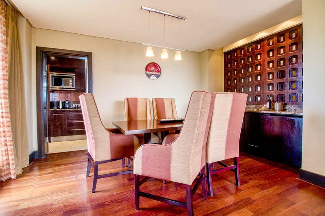 The Sky Vista One Bedroom Residence has its own private entrance and comprises a bedroom, en-suite bathroom, lounge, dining room and kitchen. The bedroom is furnished with a king-size bed and offers an en-suite bathroom fitted with a toilet, basin, shower and bath. The kitchen is equipped with a bar fridge and microwave. The lounge offers a TV and Wi-Fi.