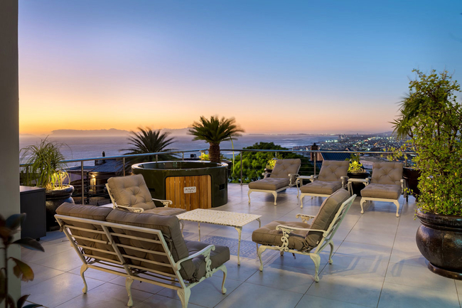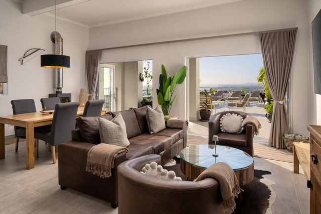 Between the ocean and the mountains, PheZulu Manor in Gordon’s Bay presents a luxurious six-bedroom villa, fully serviced and able to host up to twelve guests. The property combines elegance with comfort, offering two kitchens, refined lounges, five terraces, and a hot tub with sweeping ocean views, creating the ideal balance between shared experiences and private retreats.