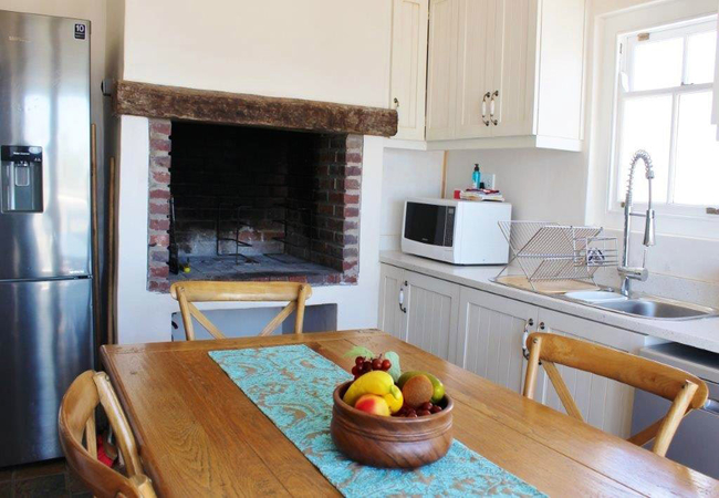 The kitchen is well-equipped and features a stove, oven, fridge-freezer and microwave. There is also a built-in braai.