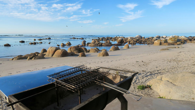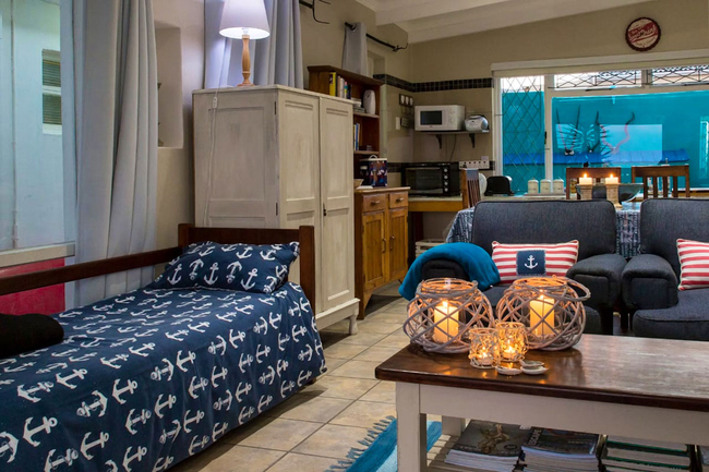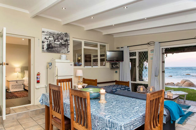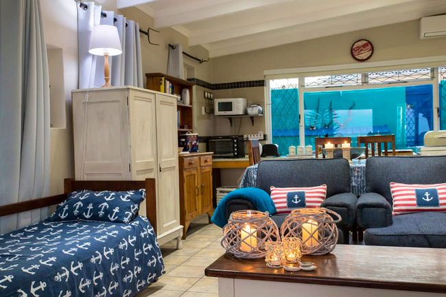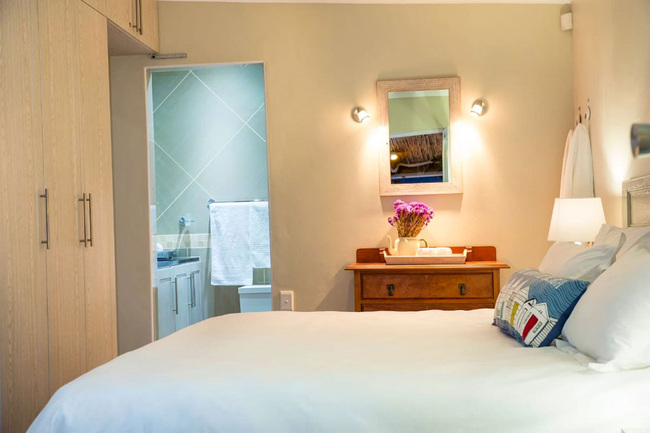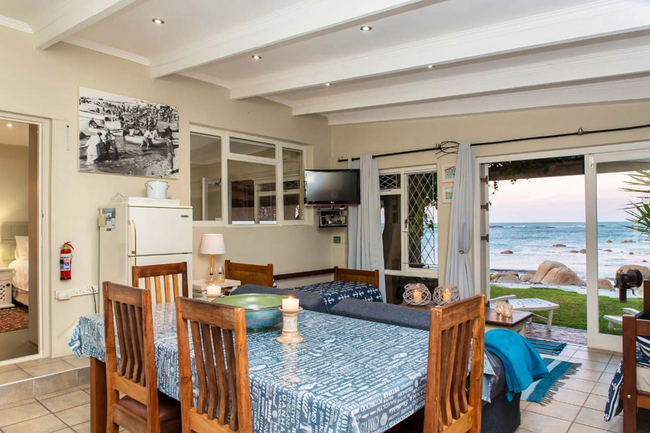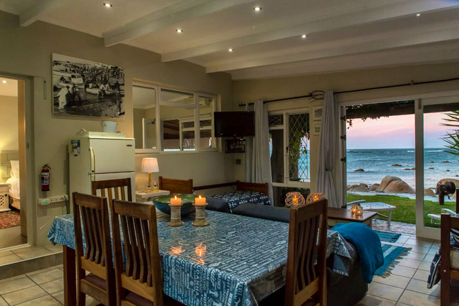The villa features a beautifully appointed bedroom with an en-suite bathroom, complete with a shower, toilet, and basin. The plush king-size bed, fitted with electric blankets for added comfort, can be converted into twin beds if preferred. Large windows frame breathtaking sea views, while a private door leads directly to the covered patio and beach. For those who enjoy fresh-air indulgence, a warm outdoor shower is also available. Designed for seamless indoor-outdoor living, the open-plan kitchen and lounge area extend onto a small lawn that meets the beach. The inviting lounge is furnished with versatile couches that convert into single beds, ensuring additional sleeping space without compromising on comfort. A dining table with four chairs completes the kitchen area, which is fully equipped with modern appliances, including an induction plate, convection oven, coffee maker, kettle, soda stream, dishwasher, and washing machine. The villa is air-conditioned, and guests have access to DStv and uncapped Wi-Fi. Linen, including bath and beach towels, is provided for convenience. Enhancing the outdoor experience, a private, roofed veranda with an indoor braai facility offers an inviting space for year-round entertaining, while an additional outdoor braai caters to those who prefer open-air cooking. The tidal pool in front of the villa provides a safe and enjoyable spot for families with young children. A private lock-up garage is available for secure parking. To ensure uninterrupted comfort, Piccolo Villa is equipped with backup power, allowing essential amenities such as lights, the fridge, Wi-Fi, and TV to remain operational during loadshedding.