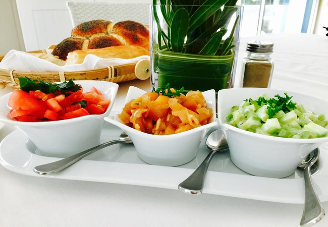 Continental and English breakfast is served on the veranda overlooking the garden and pool. We serve freshly baked bread rolls, freshly squeezed orange juice, fresh fruit, cold meats and cheese, cereals and yogurt and eggs cooked to your liking.
