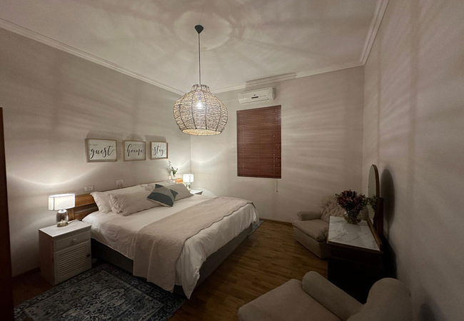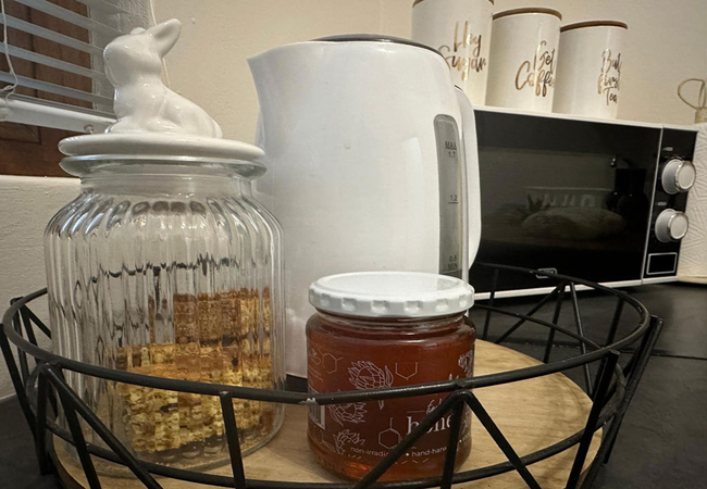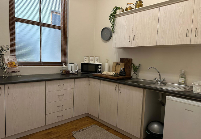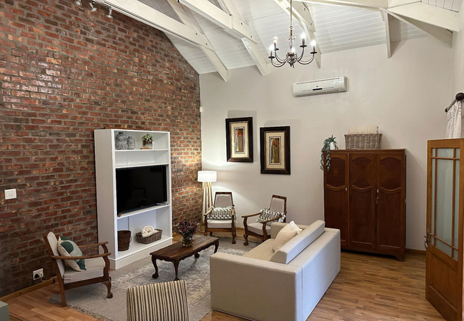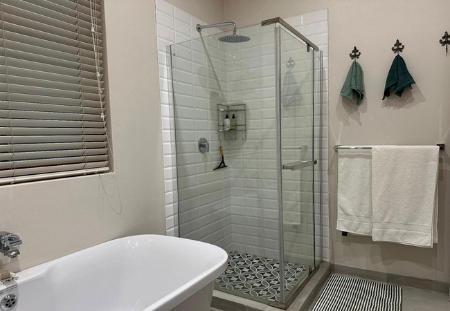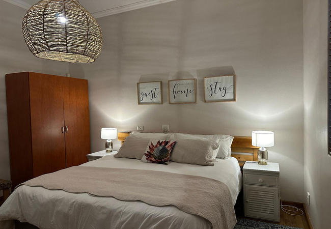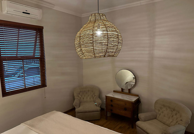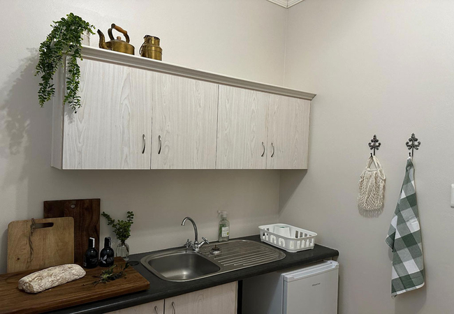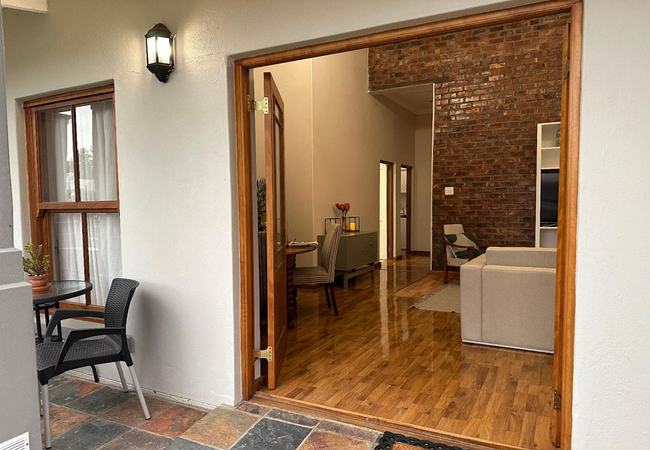 Piekfijn is a beautifully furnished, high-ceilinged cottage that can accommodate up to four guests. The air-conditioned bedroom is furnished with a King-size bed and a seating area. The luxurious full bathroom contains a separate tub and shower. Bed linen and bath towels are provided. The kitchen is well-equipped for preparing meals. The air-conditioned lounge area features a sleeper couch that folds out to a comfortable double bed, as well as a flat-screen Smart TV. The cosy dining area is the perfect place to enjoy relaxed meals. The cottage opens to a small covered patio with a table and two chairs, ideal for sipping your coffee in the morning. There is also a gas kettle braai. The cottage is run on solar power.