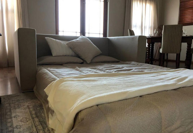 The kitchen is well-equipped for preparing meals. The air-conditioned lounge area features a sleeper couch that folds out to a comfortable double bed, as well as a flat-screen Smart TV. The cosy dining area is the perfect place to enjoy relaxed meals.