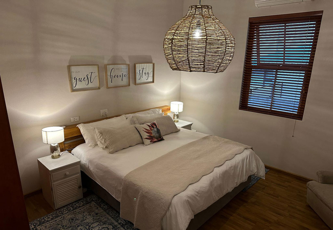 Piekfijn is a beautifully furnished, high-ceilinged cottage that can accommodate up to four guests. The air-conditioned bedroom is furnished with a King-size bed and a seating area. The luxurious full bathroom contains a separate tub and shower. Bed linen and bath towels are provided.