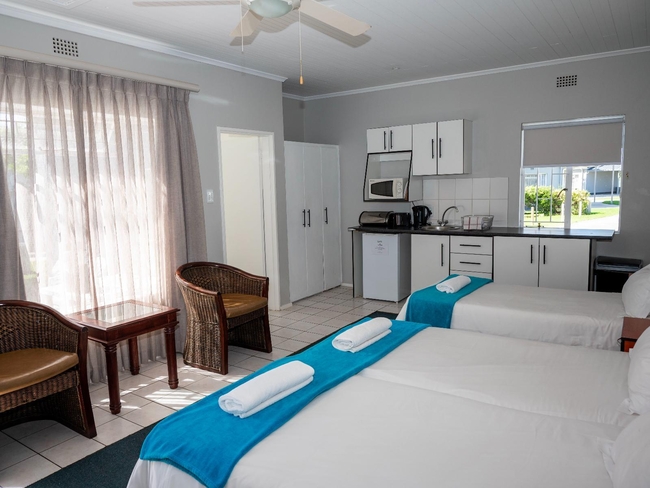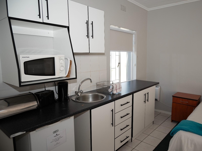 This unit features a comfortable bedroom with two single beds and a private bathroom equipped with a shower. The kitchenette includes a microwave, electric frying pan, kettle, toaster, bar fridge, and essential utensils, providing everything needed for a convenient self-catering stay. Guests can enjoy modern amenities such as Wi-Fi, air conditioning, a ceiling fan, a TV with DSTV/Satellite channels, and a safe for added security. A cleaning service is available to ensure a hassle-free experience. The unit also offers a garden view and access to outdoor furniture and a dining area, perfect for relaxing outdoors. Secure parking is provided for added convenience.