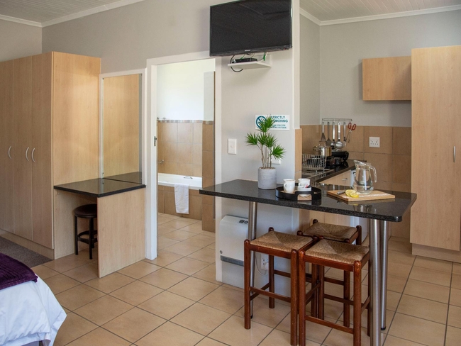 This open-plan unit features three single beds and a bathroom with a bath/shower combination. The kitchen is well-equipped with a breakfast counter and three stools, along with a microwave, electric frying pan, kettle, toaster, bar fridge, and essential utensils. Guests also have access to private braai (barbecue) facilities for outdoor cooking. Modern conveniences include Wi-Fi, air conditioning, a ceiling fan, a TV with DSTV/Satellite channels, and a safe for added security. A sitting area provides a comfortable space to unwind, while a cleaning service ensures a hassle-free stay. The unit also offers a pleasant garden view, complemented by outdoor furniture for relaxation. For added comfort, the unit is strictly non-smoking.