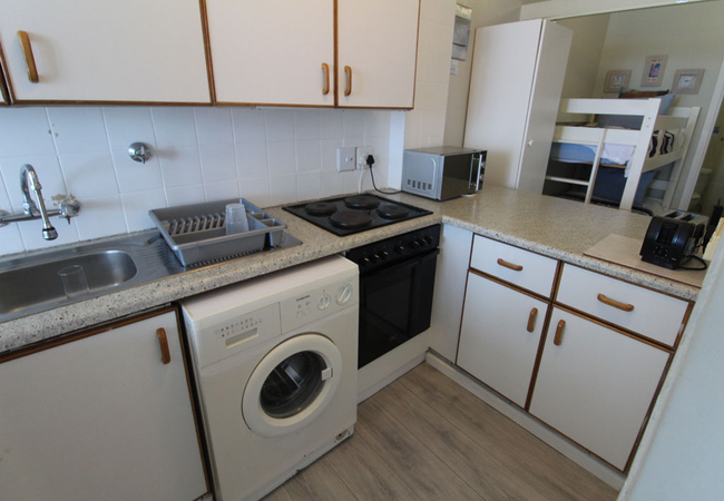 The apartment can accommodate up to four guests and has one bedroom furnished with a double bed. There is also an alcove that contains a bunk bed. The bathroom fitted with a shower, toilet, bidet and a washbasin. The kitchen is fully equipped for self-catering and contains a washing machine, stove, oven, fridge-freezer, microwave, and cutlery and crockery. The dining area has seating space for 6 people, while the lounge has a comfy lounge suite and a flat-screen TV with DStv. The living area opens up onto a lovely balcony which has gas braai facilities and a view of the ocean.