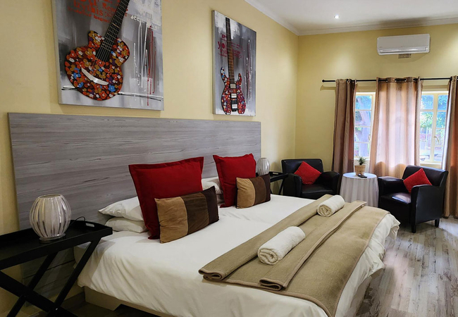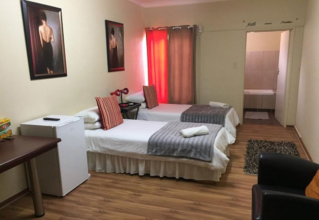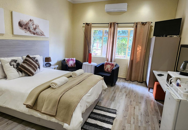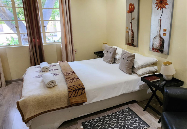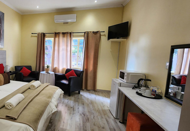 The Standard Room is furnished with a double bed. The en-suite bathroom is fitted with a shower, toilet and basin. High-quality linen including towels is provided. Each room has a small work table and chair, a flat-screen TV with Openview channels, a tea and coffee station, and free Wi-Fi internet access.