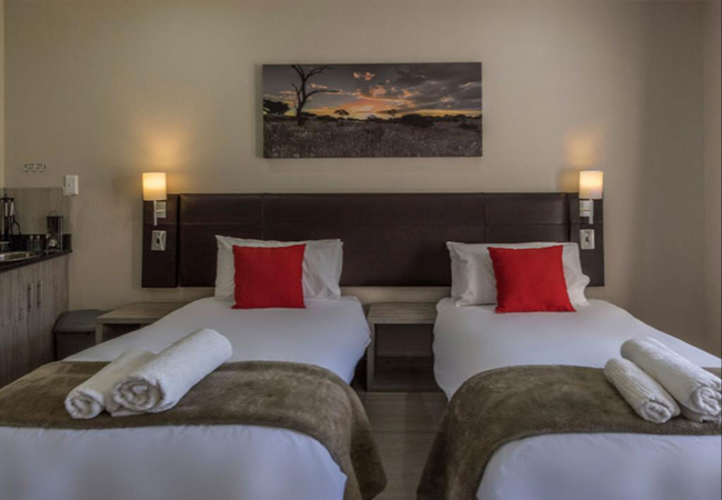 Deluxe Rooms are furnished with twin single beds. The en-suite bathroom is fitted with a shower or shower over the bath, toilet and basin. High-quality linen including towels is provided. Each room has a small work table and chair, a flat-screen TV with Openview channels, a tea and coffee station, and free Wi-Fi internet access.