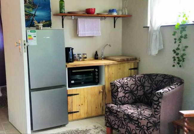 The unit has a bedroom furnished with a Queen-size bed. The en-suite bathroom is fitted with a shower, toilet and basin. There is a cosy living area with a kitchenette which is fitted with a mini-oven with a 2-plate stove, a coffee machine, a fridge-freezer, cutlery, and crockery, as well as tea- and coffee-making facilities. Wi-Fi is also available.