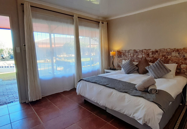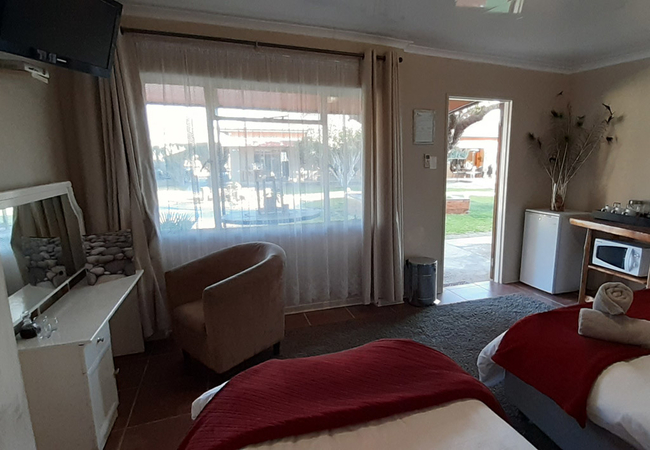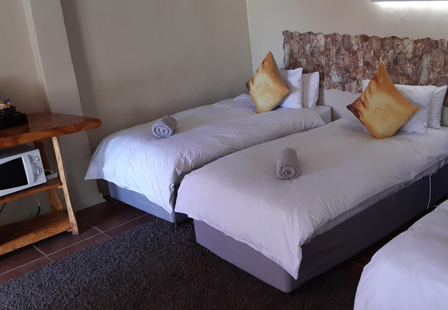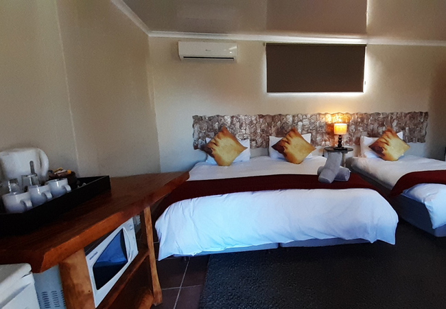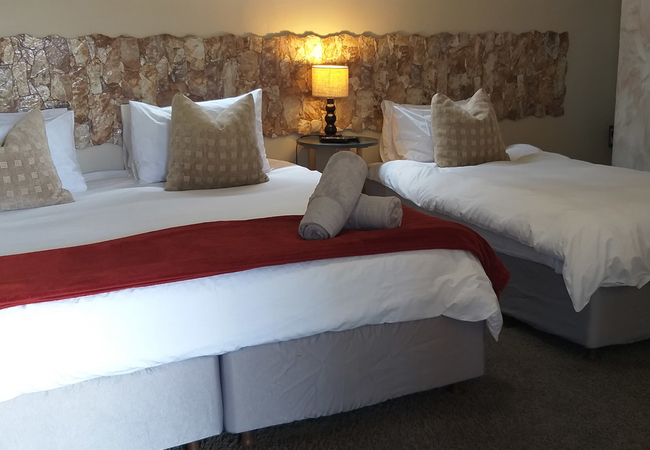 This room is located on the ground floor with a patio overlooking the Garden and pool area. The Room is equipped with 3 single beds, and an en-suite shower. Facilities include a tea / coffee station, DStv and air conditioning.