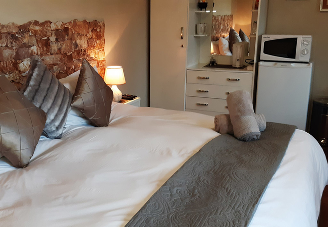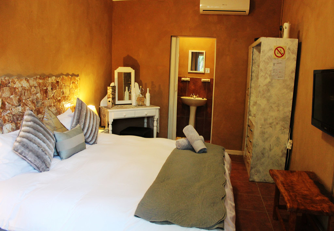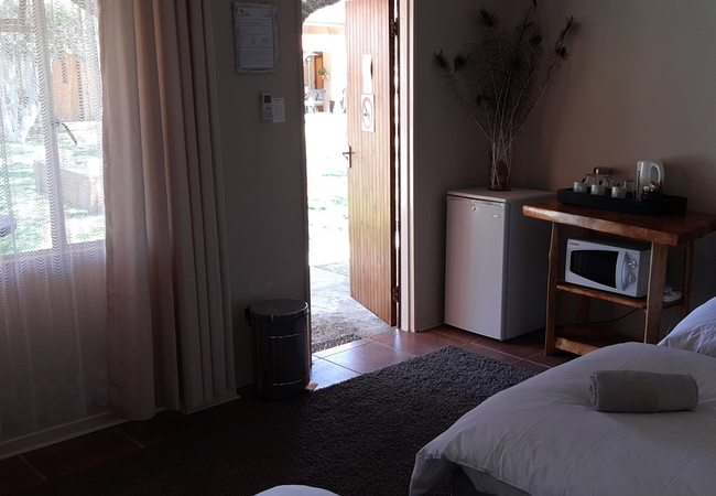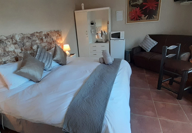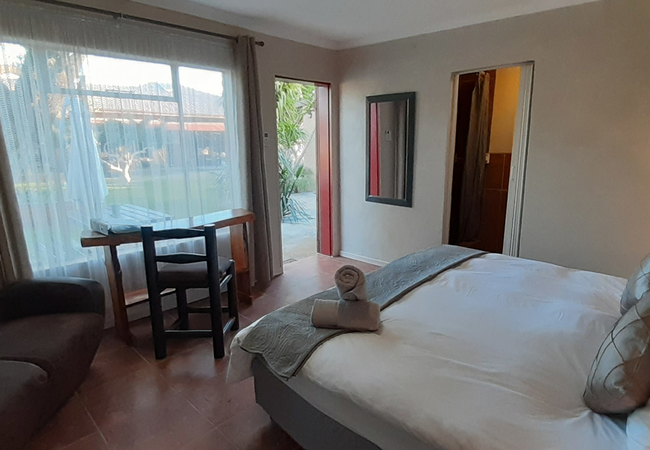 These rooms is located on the ground floor with a patio overlooking the Garden and pool area. These rooms each contain Twin/King beds and an en-suite shower. Room 2 is located in the House with a Bath only. Facilities include a tea / coffee station, DStv and air conditioning.