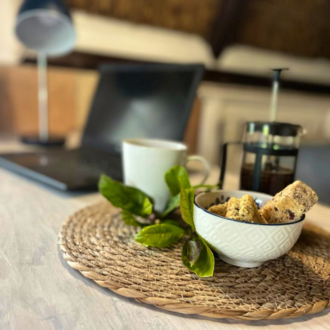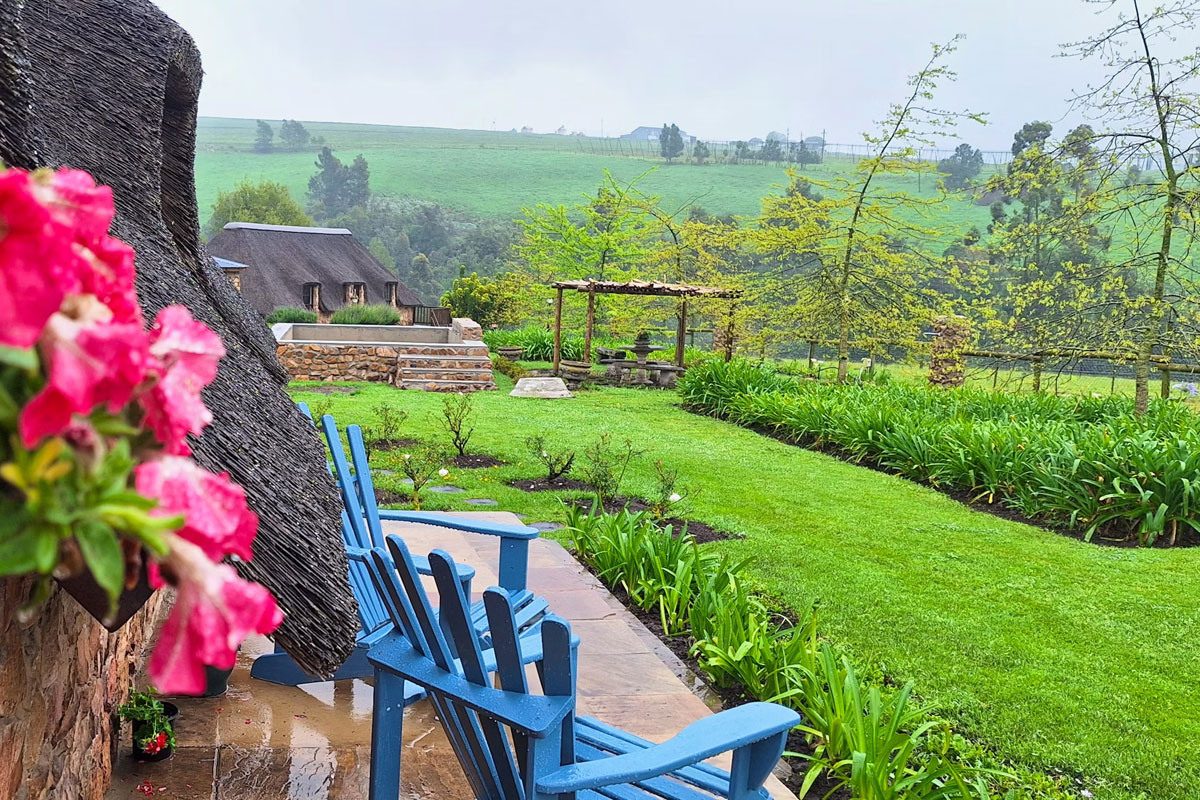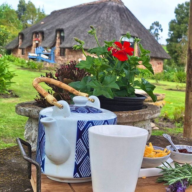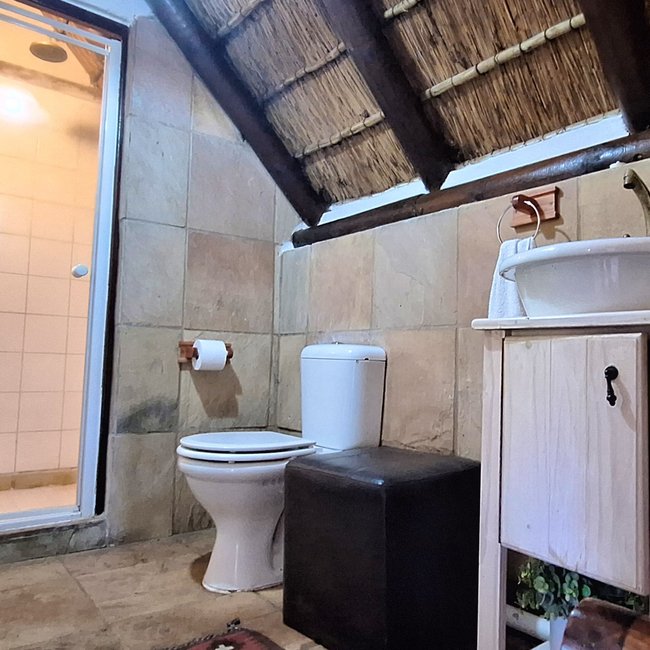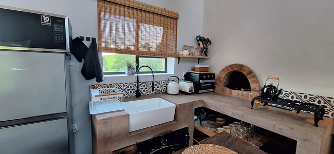 This unit accommodates 4 guests, comprising 2 bedrooms and 1 bathroom. The first room is furnished with a double bed, while the second room is furnished with single beds. These rooms share an en-suite bathroom fitted with a shower and toilet. The kitchen is equipped with an electric kettle, toaster, air-fryer, oven, fridge, microwave oven and a gas stove. Other amenities include a TV, DStv, and a swimming pool. The cottage has an open terrace with unlimited views of the garden, swimming pool, and mountains.