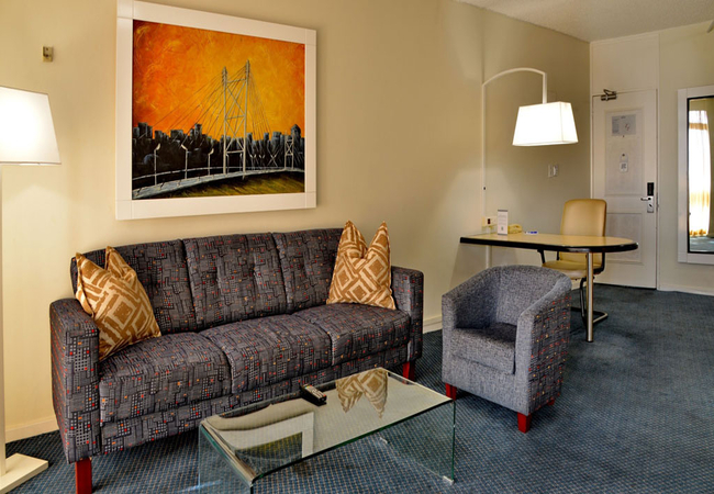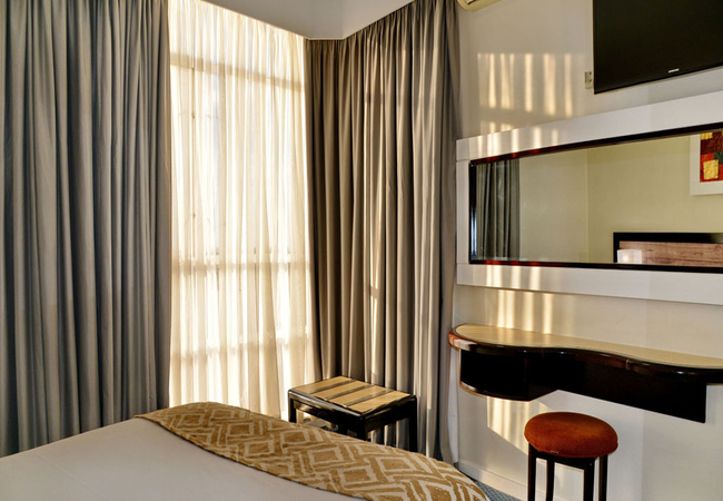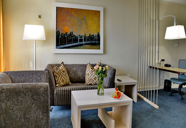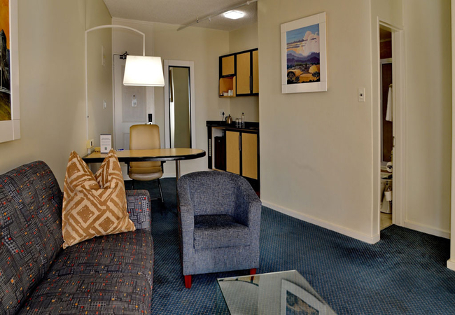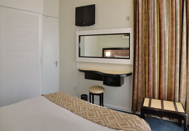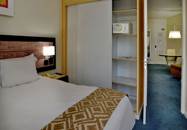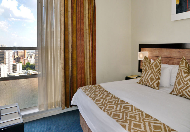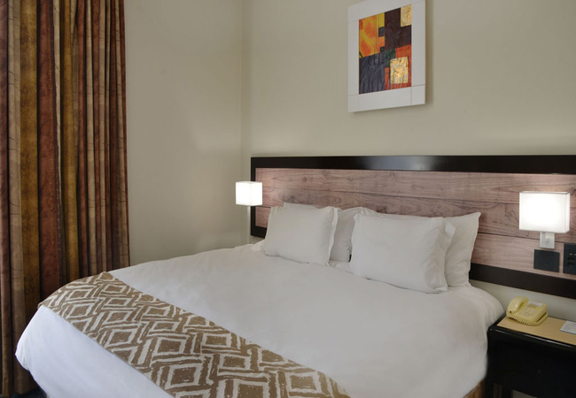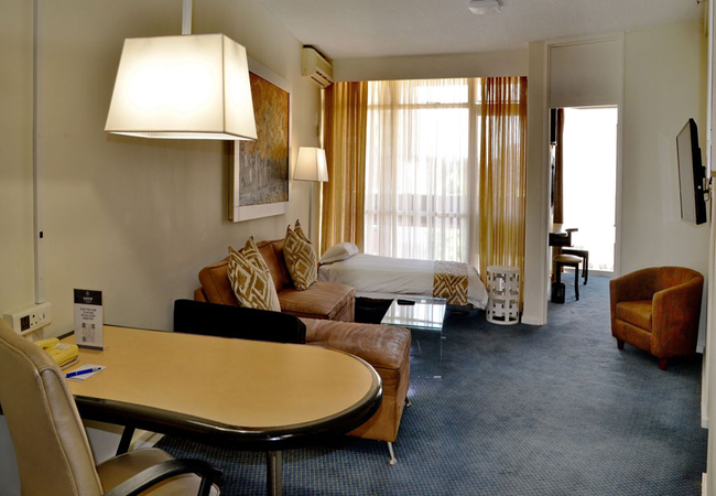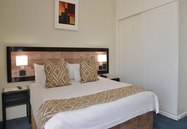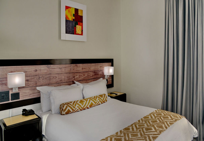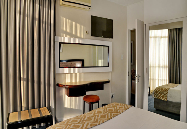 The hotel has 260 one bedroomed suites with separate lounge, bedroom, bathroom, kitchenette and work desk. A bar fridge, flat screen TV (with DSTV), digital safe, complimentary tea / coffee, complimentary bathroom amenities, air-conditioning / heating and two telephones are standard in each suite. Free WI-Fi (500 MB per person per day).
