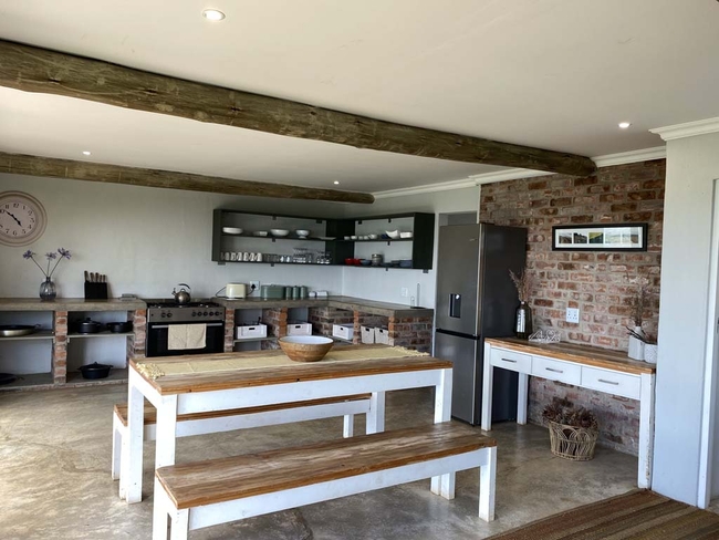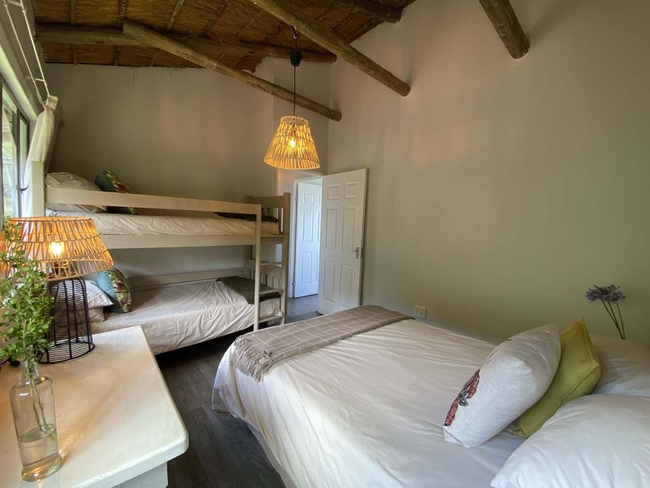 The main house is double story, accommodating 15 guests in five bedrooms, with four bathrooms. Downstairs there is a large fully equipped kitchen, which opens into the spacious dining room, two lounges, a bar, two bathrooms (one with a shower and one with a bath) and the main bedroom with an en-suite bathroom (bath and shower). The sliding doors open up to the L shaped entertainment area, where there is a gas oven, and an area for a charcoal braai. On the one side of the upstairs of the house, there is a room with a double bed, and single bed outside this room on the landing. On the other side of the upstairs of the house, there are three bedrooms, two of which have a double bed in each, and the other has two single beds and one bunk bed, on the landing there is a single bed, with a pull out bed underneath, and there is a bathroom (bath). There is a large garden and a jungle gym.