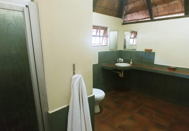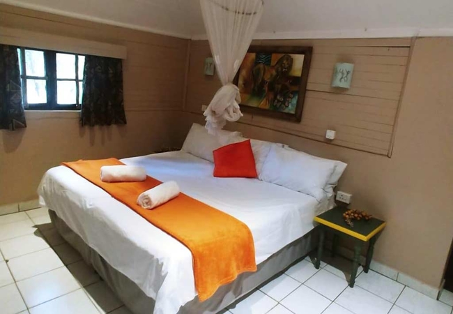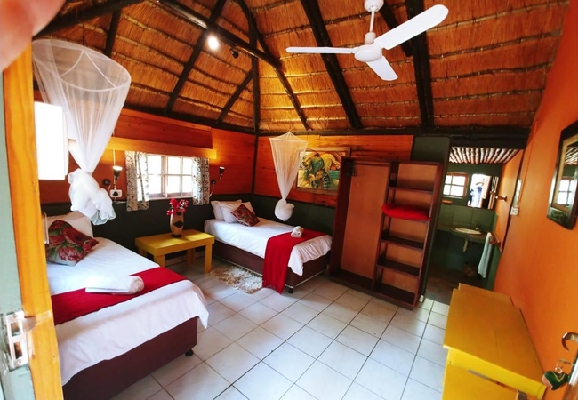 This self catering family loft thatched house has a main room with a King-size bed and three single beds in the loft. The en-suite bathroom has a shower. Ceiling fans and mosquito nets are provided as well as a coffee station. The kitchen has a four plate gas stove, microwave, kettle and toaster. Braai facilities are available outside.