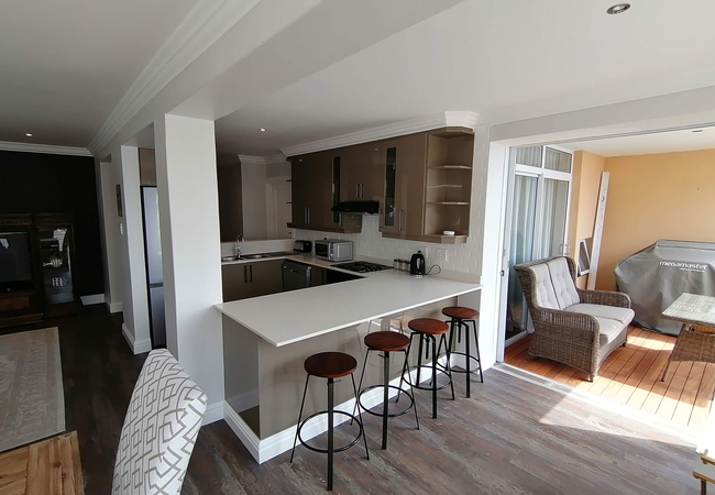 The living area opens up onto the small deck and has a flat-screen TV with a full selection of DStv channels. There is also a six seater dining table with chairs.