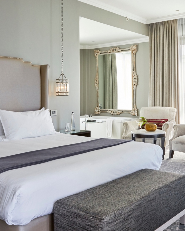 The Queen Victoria Hotel at the V&A Waterfront features thirty-two rooms and three suites, each exuding sophistication and understated opulence. Every room and suite is tastefully decorated, incorporating touches of regal purple, bespoke wallpaper, and artwork inspired by local fynbos, harmonizing with the property's location and aesthetic.