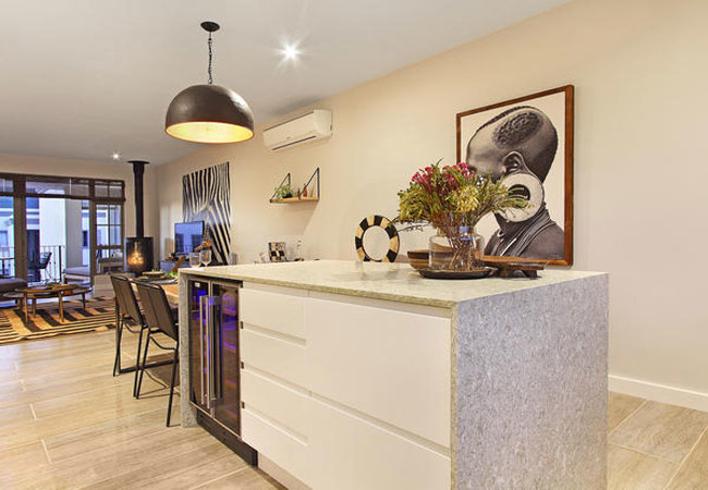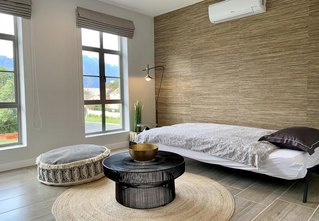 Rainbow Residence has two bedrooms. The main bedroom has a King-size bed and the second bedroom has a sofa bed for one guest. There are two bathrooms, one with a bath and shower and the other with a shower. The beds are top quality with finest linen and guests can choose between down and synthetic duvets and pillows. Charlotte Rhys amenities, LED cosmetic mirrors and a hairdryer are provided for your comfort. The kitchen is fully equipped and includes a dishwasher and washing machine. The living area is comfortable and cosy with a fireplace. There is a 49 inch flat screen smart TV offering international channels and a Marshall Acton Bluetooth speaker for your entertainment. Guests can enjoy free Wi-Fi and will be provided with a local mobile phone during their stay. The covered patio is the perfect place for a relaxed breakfast with magnificent mountain views as well as the perfect sundowner location providing a stylish and comfortable dining and lounge area.