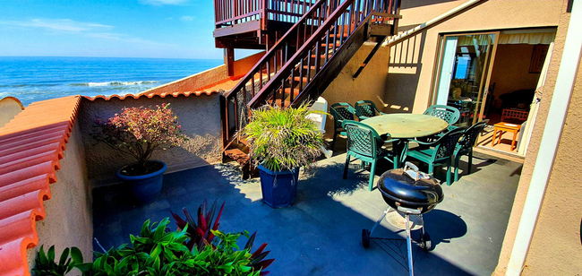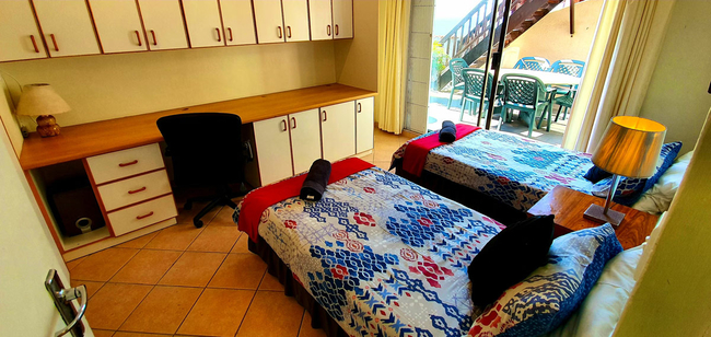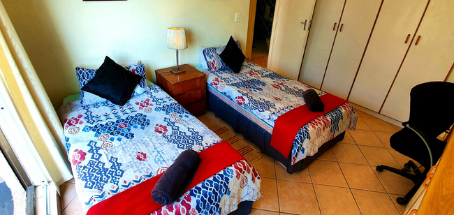 A sliding door leads from the living area to a patio furnished with a kettle braai, table, and chairs, with a few steps leading up to the wooden viewing deck. Secure parking is available in the basement of the complex. The property is only 100 metres from the beach and within easy walking distance of Margate.